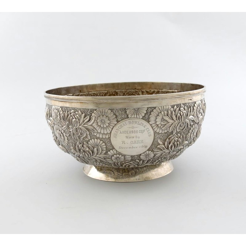 circular form, chased and embossed floral decoration, inscribed 'Shanghai Bowling Club, Anderson Cup', won by R. Carr, December 1905', on a spread circular foot, height 11.8cm, diameter 22.2cm, height approx. weight 32oz.