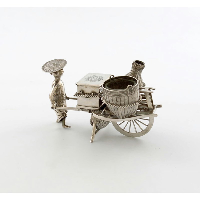 modelled as a street seller pushing a cart, with a basket pepper and salt and a rectangular box, length 10cm, approx. weight 4oz.