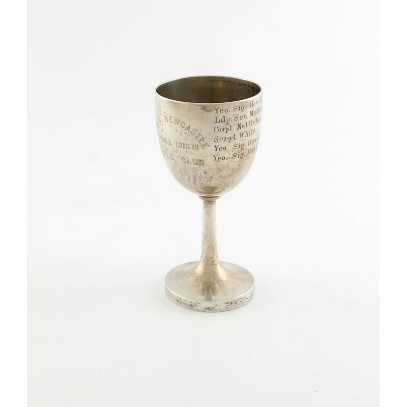 urn bowl, of a raised tapering stem, inscribed 'HMS Newcastle, China 1910.12 Rifle Club', the reverse inscribed with winners names, height 13cm, approx. weight 4oz.