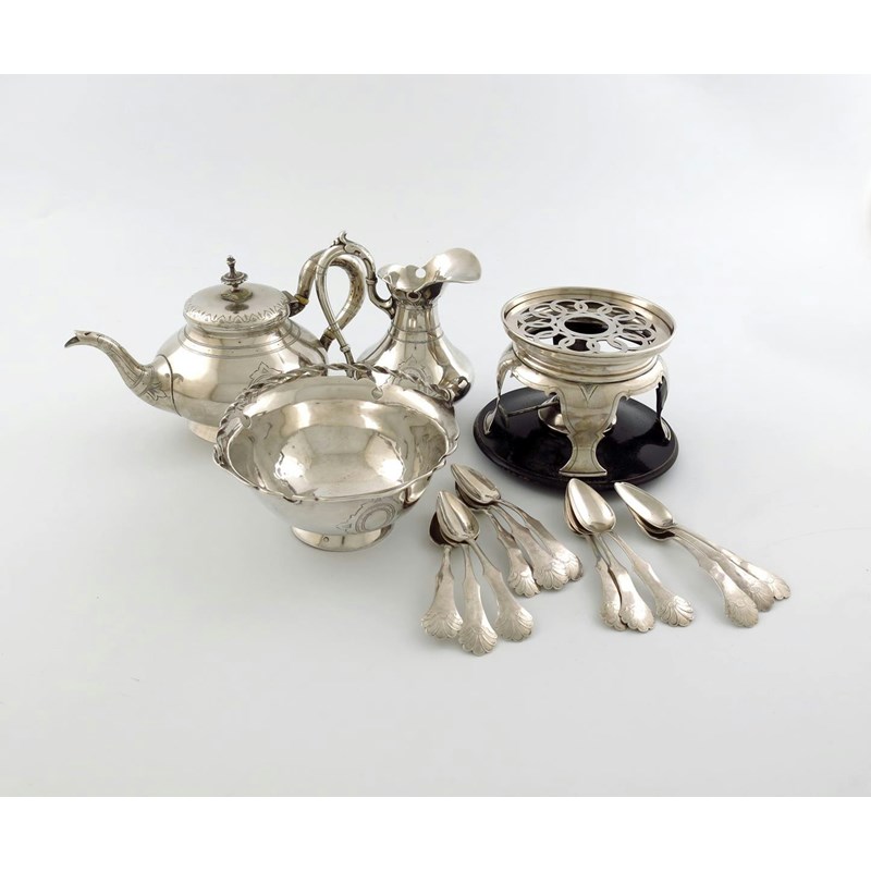 λ A 19th century three-piece Dutch tea set and twelve teaspoons
