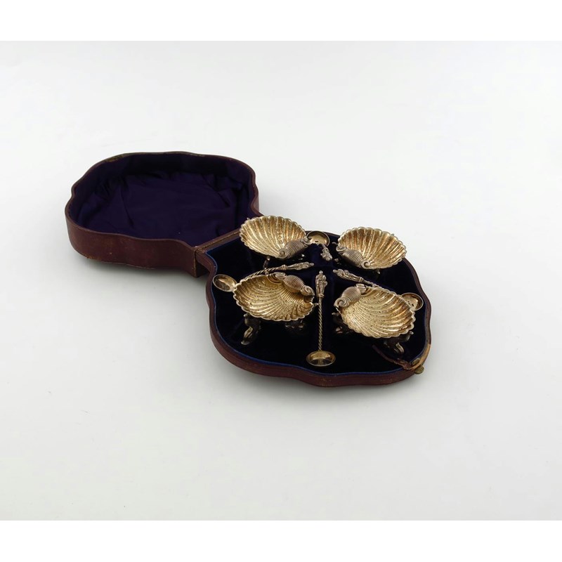 shell form, gilded bowls on three mythical dolphin feet, with foru salt celalrs, in a fitted case, approx. weight 3.5oz.