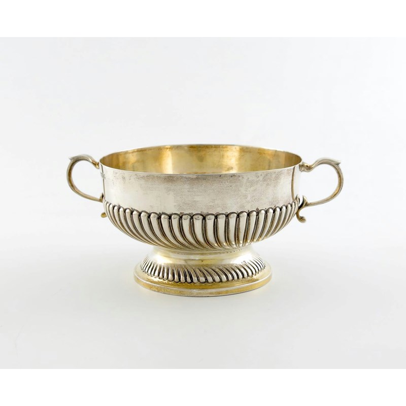 circular fluted form, scroll handles, on a raised fluted circular foot, with traces of gilding, diameter 12.8cm, approx. weight 10oz.