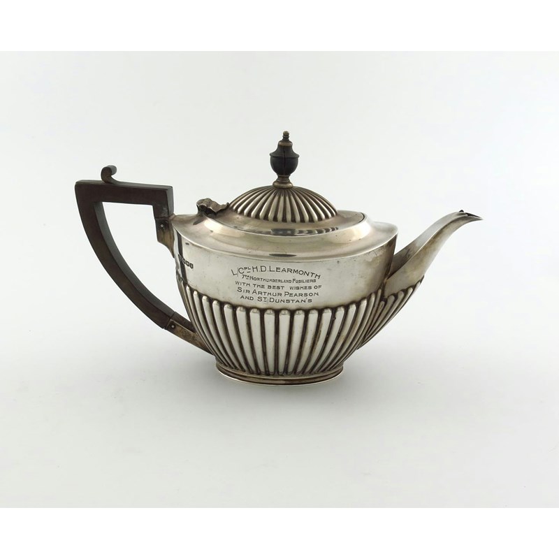 oval form, part-fluted decoration, scroll handle, inscribed 'L/Cpl H.D. Learmonth, 7th Northumberland Fusiliers with the best wishes of Sir Arthur Pearson and St. Dunstans', length handle to spout 25.5cm, approx. weight 14oz.