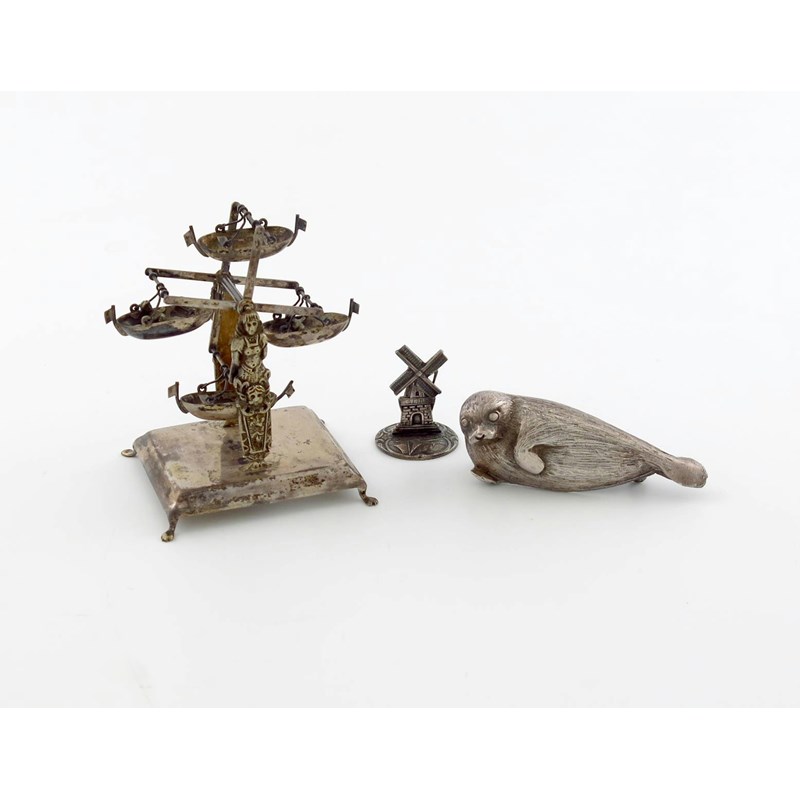 comprising: a modern finial, modelled as a recumbent seal, a miniature toy modelled as a fairground gondola, and a miniature windmill. (3)