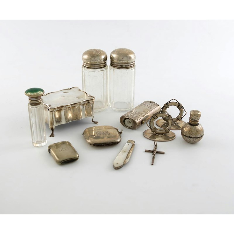comprising: a pair of menu card holders modelled as life buoys, Birmingham 1913, on circular bases, a trinket box, two vesta cased, a scent bottle, a torch, with engraved decoration, a fruit knife, three toilet bottles and a crucifix, approx. weighable 4oz. (12)