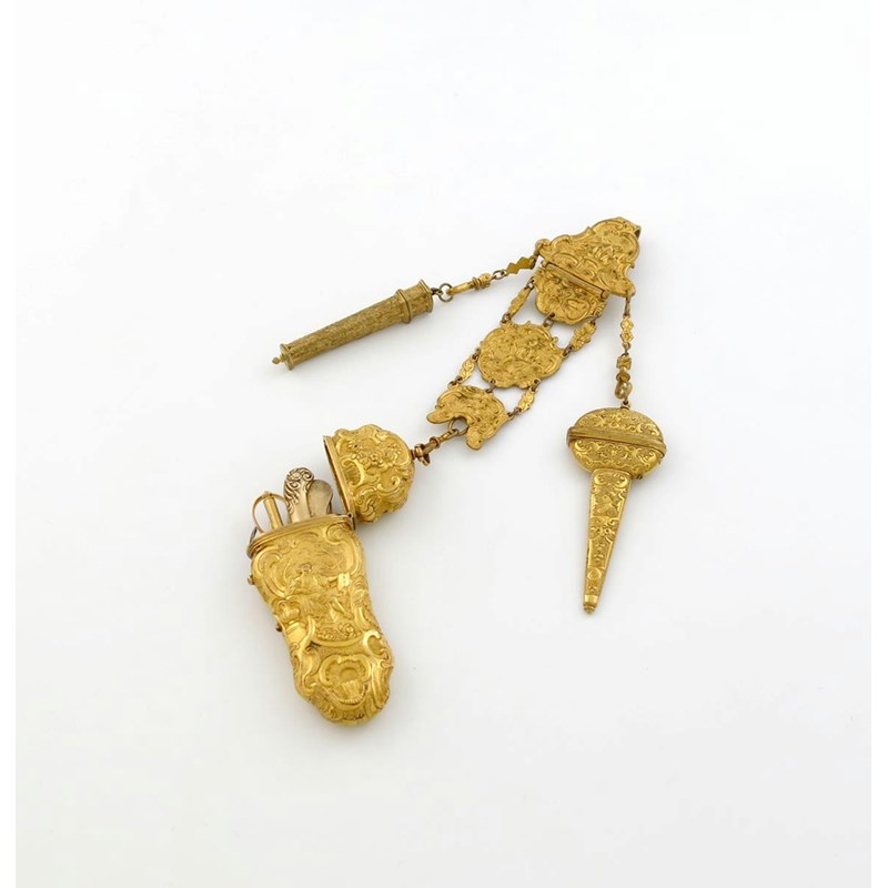 of shaped tapering form, with figural and scroll decoration, on a matted background, the interior fitted with instruments, on a chatalaine clip with a hanging scissor case and needle case, length 25cm.