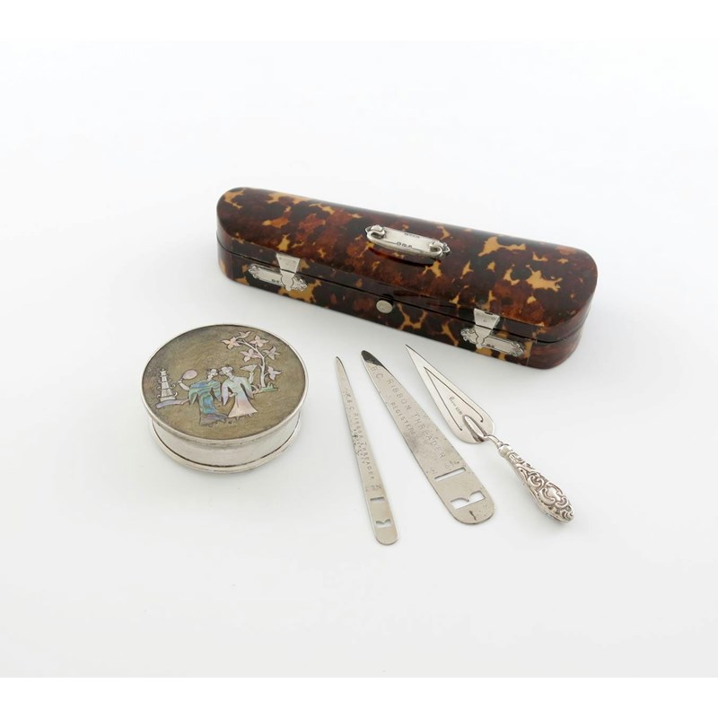 λ A late-Victorian silver-mounted tortoiseshell violin case, by Saunders and Shepherd, Chester 1894, with a silver handle and silver simulated locks, green velvet lined, length 13.7cm, plus an Edwardian silver and tortoiseshell box, Birmingham 1907, circular form, the hinged cover inlaid with mother-of-pearl figures, and a page marker, plus two base metal ribbon threaders. (5)