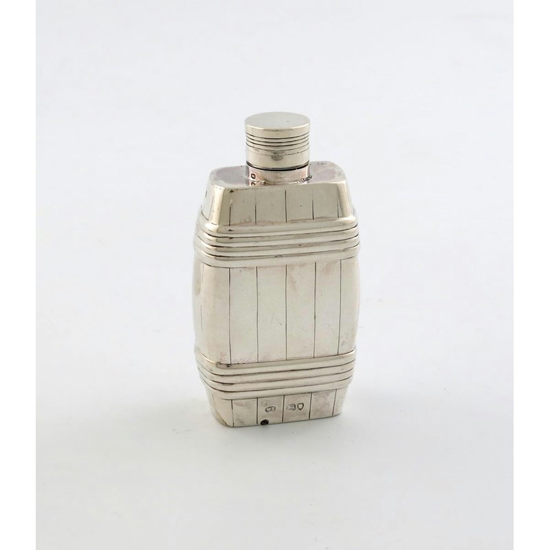 shaped rectangular barrel form, hinged cover, with coopered and stave decoration, length 9.8cm, approx. weight 3.2oz.