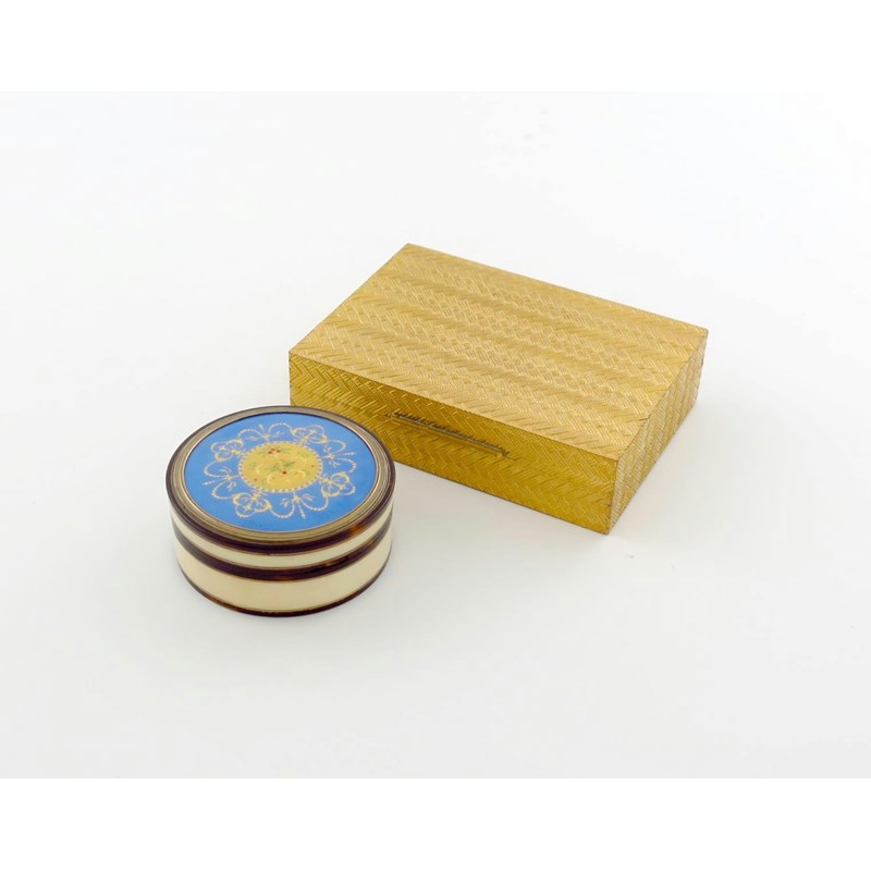 λ An Italian gilt-metal cigarette box, rectangular form, basket-weave decoration, plain thumb-piece, length 11.2cm, plus a 19th century ivory snuff box, with tortoiseshell banding and a painted cover. (2).