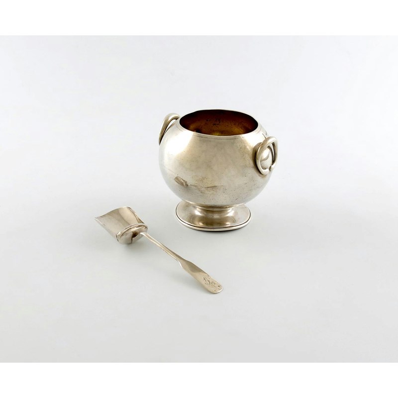 circular cauldron form, scroll side handles, gilded bowl, on a circular foot, height 7.8cm, plus a George III silver Fiddle pattern caddy spoon, by Joseph Taylor, Birmingham 1797, approx. weight 7oz. (2)