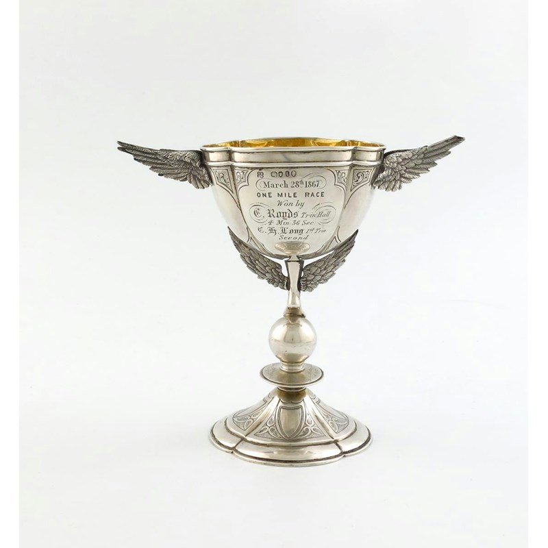lobed circular form, gilded bowl, with winged handles, on a column modelled as a winged foot, on a raised shaped circular foot, engraved decoration,applied with the arms of Cambridge University Athletic Sports and inscribed 'March 28th 1867, One Mile Race, won by E. Boyds, Trin. Hall, 4mins 36Sec, C.H. Long 1st Trin. second', height 18cm, approx. weight 9.8oz.