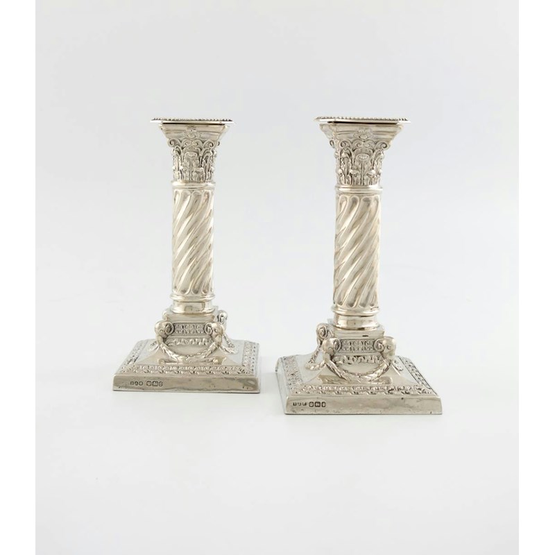 Corinthian column form, swirl-fluted columns, on raised square bases with ram's heads, swags and acanthus leaf borders, height 7.7cm. (2)