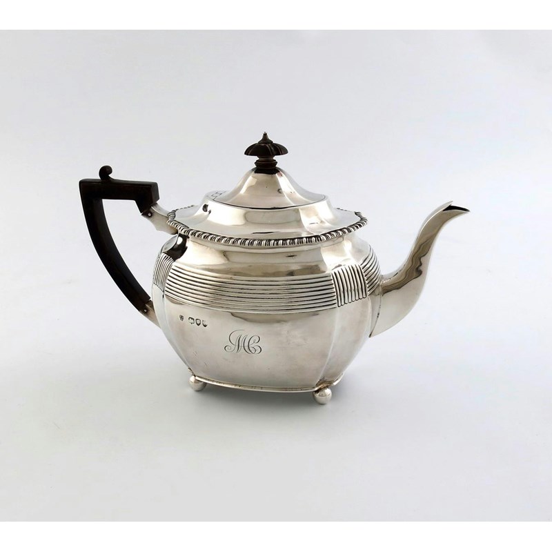 oblong bellied form, scroll handle, gadroon border, flush hinged domed cover, on four ball feet, engraved with a monogram and 'Mary Batten, on her marriage from Viscount Falmouth April 18 1894', length handle to spout 27cm, approx. weight 21.5oz.