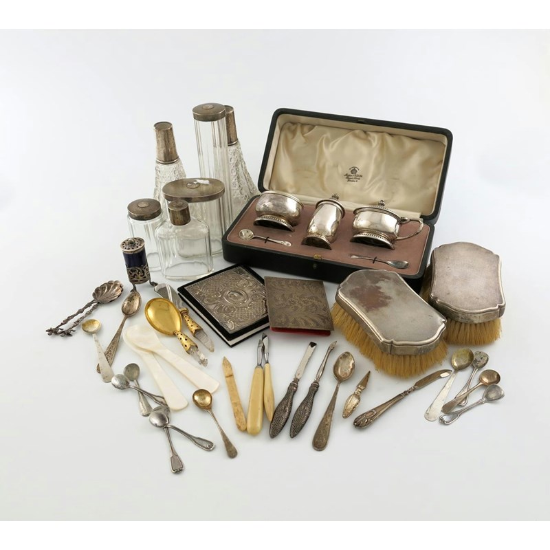 λ A mixed lot of silver items, various dates and makers, comprising: a cased three-piece condiment set, by Mappin and Web, Sheffield 1941 and Birmingham 1937, plus a pair of military brushes, four silver-mounted toilet jars, a pair of scent bottles, (no stoppers), and other items including flatware. (qty)
