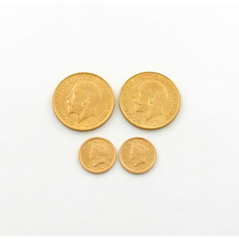 George V, gold Sovereigns (2) 1913, 1913 M; unofficial reproduction US Dollars (2), 1853. Very fine. (4)