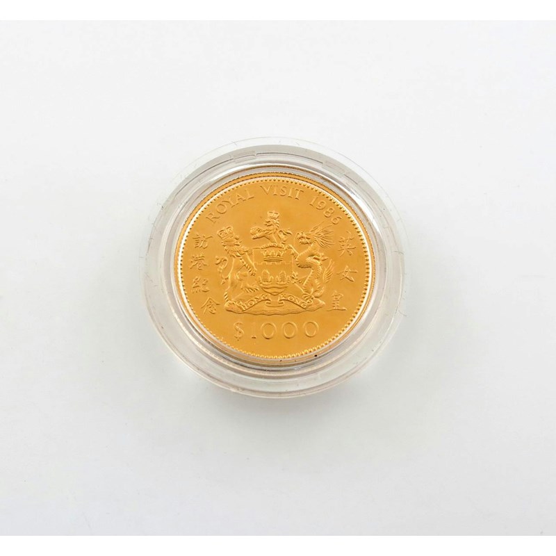 Hong Kong, Elizabeth II, Royal Visit, gold proof 1000-Dollars, 1986, bust right, rev., arms, in case of issue. Brilliant mint state.