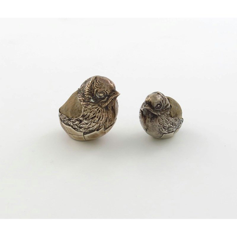 modelled as a chick emerging from an egg, height 4.5cm, plus a matching smaller chick emerging from an egg, Chester 1909. (2)