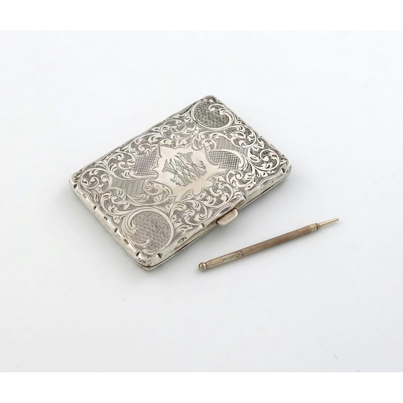 rectangular form, engraved foliate scroll decoration, engraved with a monogram, fitted interior with a pencil, length 9.8cm.