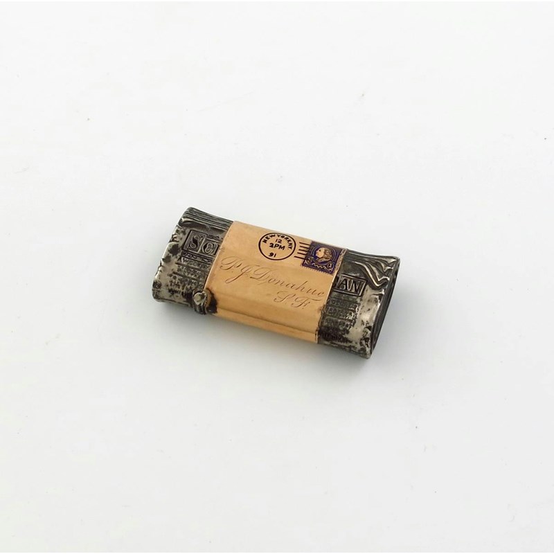 modelled as a rolled up copy of 'The Scientific American', with a gold sleeve and enamelled stamp and with an enamelled post mark for 'New York 2pm 12 90', and inscribed 'P.J. Donahue, S.F, length 5.8cm.