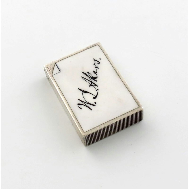 rectangular form, hinged cover, the form enamelled with a signature W.L. Akers, on a white ground with a turned corner, length 5cm, approx. weight 1.9oz.