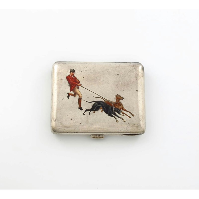 rectangular form, the cover with a gentleman in a hunting pink jacket taking two greyhounds for a walk, the reverse with a signature and dated '1896', length 8.8cm, approx. weight 4.5oz.