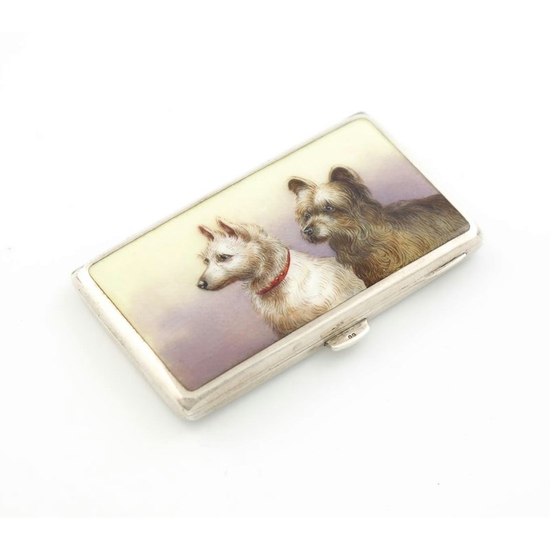 rectangular form, the hinged cover with two terriers, length 8cm, approx. weight 2.6cm.