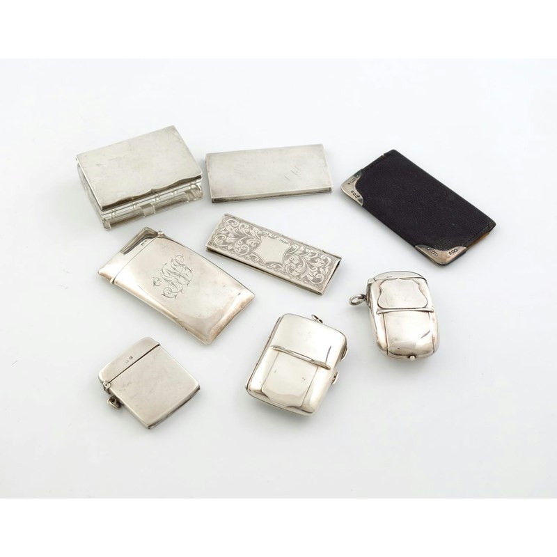 comprising: an Edwardian card case, of rectangular form, the side with a hinged stamp compartment, Birmingham 1909, a vesta case / stamp case, Birmingham 1911, a vesta /sovereign case/stamp case, Birmingham 1905, a vesta/ sovereign case, a silver mounted double glass stamp box, hinged cover, and three other cases, approx. weighable 7.5oz. (8)