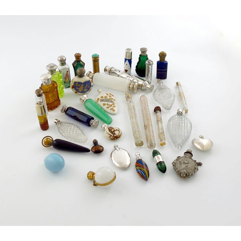 comprising: a Victorian bottle decorated with an owl, Birmingham 1888, one by Gallé, double ended scent bottle, various silver-mounted coloured glass bottles, one of egg form, and various other designs. (qty)