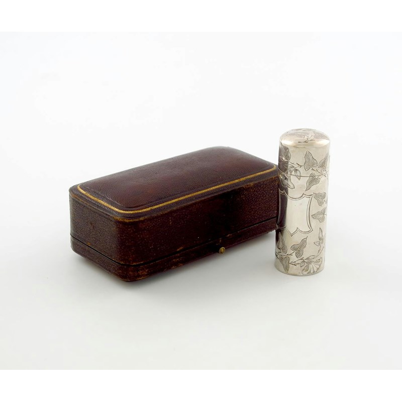 cylindrical form, engraved foliate decoration, in a fitted case, length 6cm.