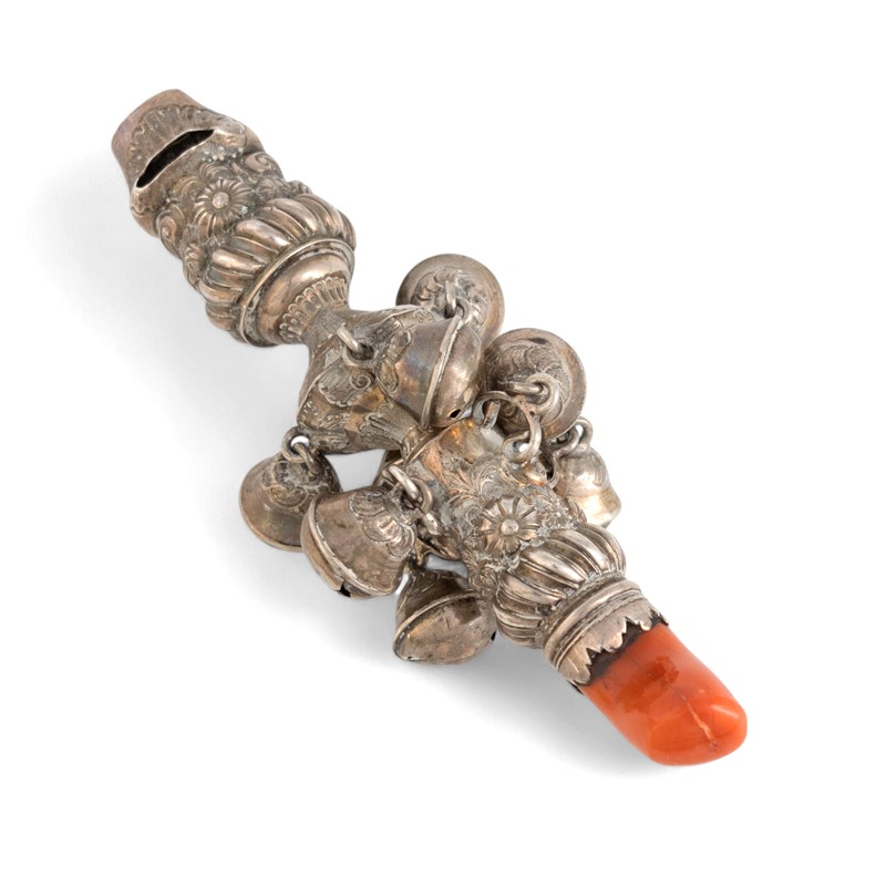 baluster and fluted circular form, chased foliate scroll decoration, tapering short coral teether, with eight hanging bells and a hinged ring attachment, with initials, length 12.8cm, approx. weight 2.5oz.