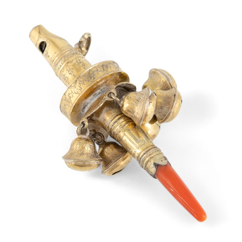 λ A George III silver-gilt baby's rattle, whistle and teether,