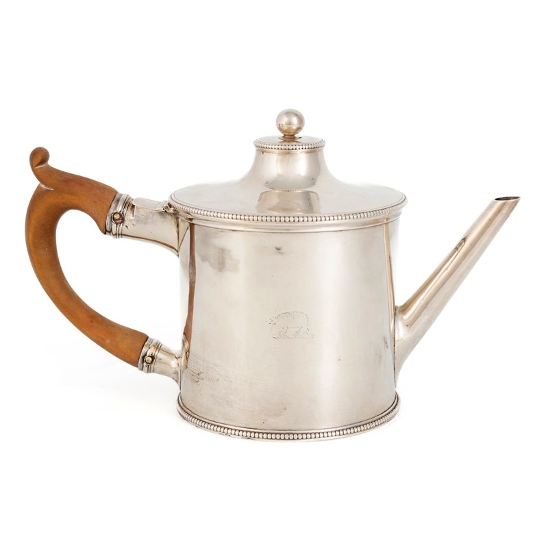 circular form, scroll handle, with a water compartment with a hinged cover, beaded borders, the pull-off cover with a ball finial, engraved with a crest, height 12.5cm, approx. weight 14.8oz.