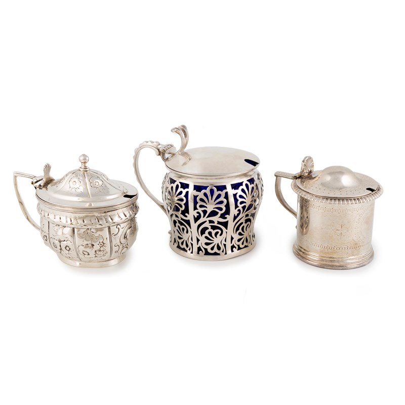 A collection of three silver mustard pots,