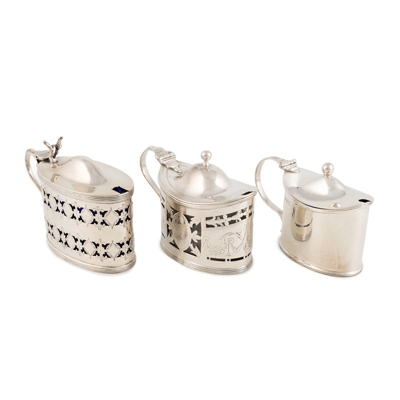 comprising: one by Robert Hennell, London 1791, oval form, pierced and engraved decoration, the hinged cover with a ball finial, with a crest, clear glass liner, plus an Edwardian one, by Thomas Bradbury and Sons, Sheffield 1903, oval form, pierced and engraved decoration, with a blue glass liner, and a Victorian one, London 1886, plain oval form, later glass liner, approx. total weight 10.5oz. (3)