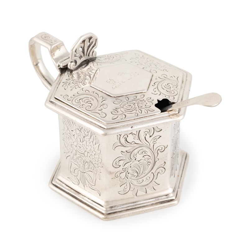 hexagonal form, with engraved scroll foliate decoration, the cover engraved with two worn crests, with a clear glass liner and associated spoon, height 7.4cm, approx. weight 5.9oz. (2)