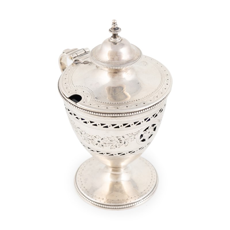 urn form with beaded borders, pierced and engraved with foliate decoration, raised cover with a knop finial, engraved crest to the cover, on a raised circular foot, with a blue glass liner, height 11.6cm, approx. weight 4.2oz.