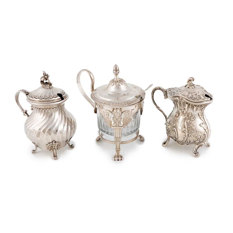 comprising: an early-19th century French one by Jean Pierre Nicolas Bibron, Paris circa 1800, circular form decorated with winged female figures, on three claw feet, clear glass liner, with an associated spoon, plus a Dutch one with importer's marks of Elkington & Co Ltd, London 1896, baluster form with embossed scroll foliate decoration, and one with the maker's mark EC, London 2008, baluster form with spiral fluted decoration, on three scroll feet, approx. total weight 8.5oz. (4)