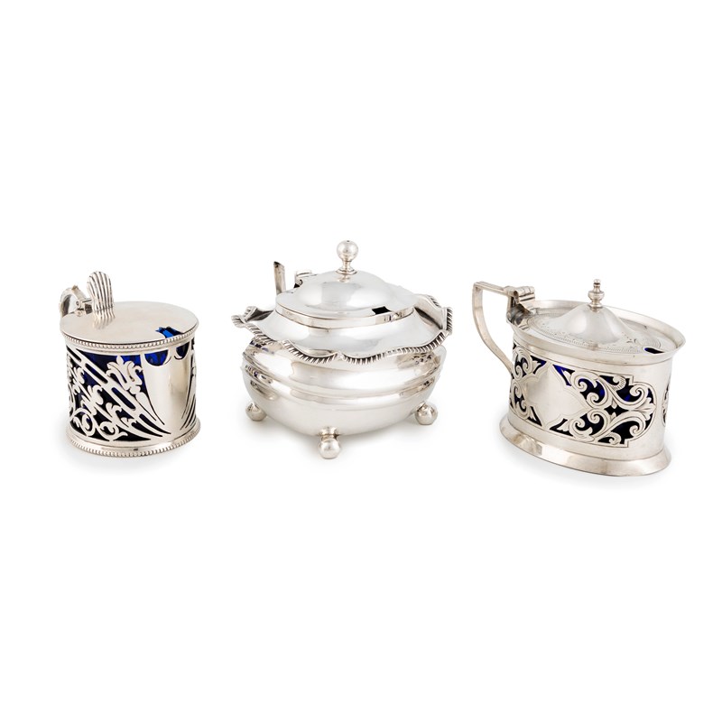 comprising: a George III one by Thomas Wallis, London 1808, rounded rectangular form with a wavy edge gadrooned border, plus a late-Victorian one by Horace Woodward & Co Ltd, London 1894, oval form with pieced scroll decoration and a later blue glass liner, and a late-Victorian one by William Hutton & Sons, London 1900, circular form with pierced scroll decoration and beaded borders, blue glass liner, approx. total weight 10.1oz. (3)