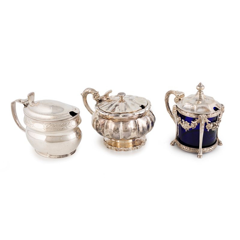 comprising: one by Deakin & Francis, Birmingham 1933, circular lobed form, with blue glass liner, plus an Edwardian one by Roberts & Belk Ltd, Sheffield 1906, circular form with foliate garlands and ram mask capped hoof feet, and one by Richard Comyns, London 1937, plain oval form with an engraved foliate top band of decoration, approx. total weight 12.8oz. (3)