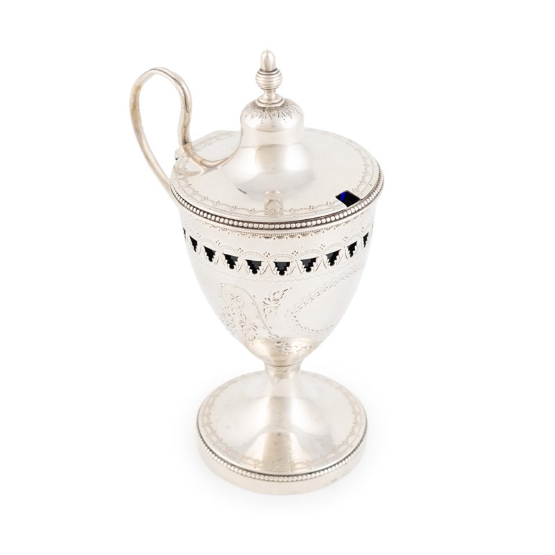 urn form with beaded borders, pierced and engraved with foliate decoration, scroll handle, the hinged cover with an acorn finial, on a raised circular foot, with a blue glass liner, height 13cm, approx. weight 3.7oz