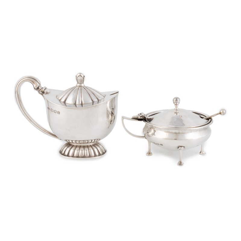 circular bellied form with spot-hammered decoration, the cover with a ball finial, a ceramic interior liner, on four pad feet with an earlier spoon, plus a modern silver mustard pot by Robert Stone, London 1951, tapering oval form, domed fluted cover with a bud finial, on a raised fluted oval foot, with a blue glass liner, height 8.4cm, approx. total weight 8oz. (3)