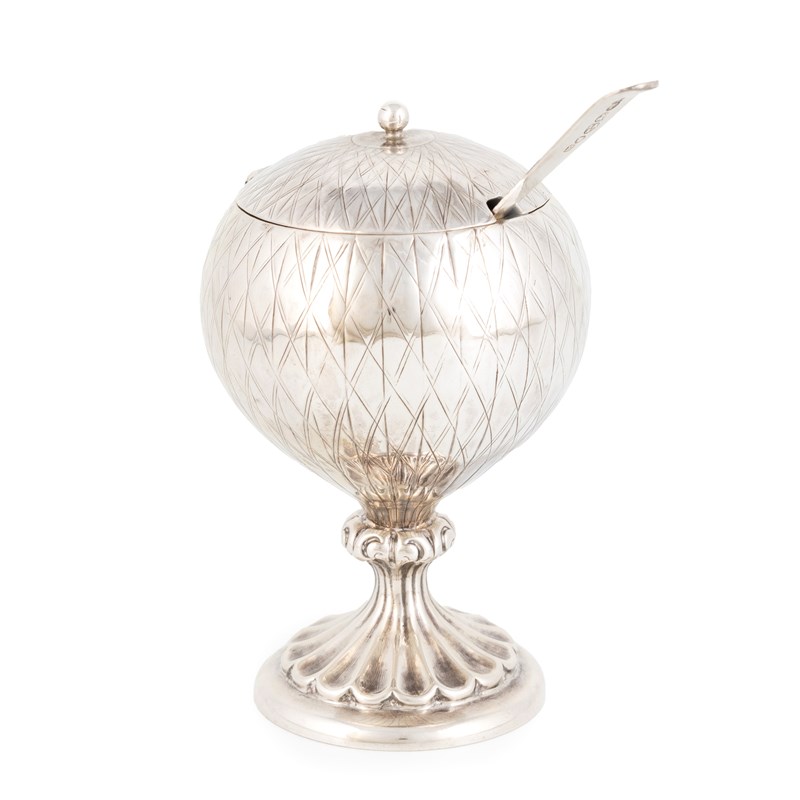 resembling a hot air balloon with engraved decoration, gilded interior, on a raised knopped fluted foot, with an associated spoon, height 12.8cm, approx. total weight 6.4oz. (2)