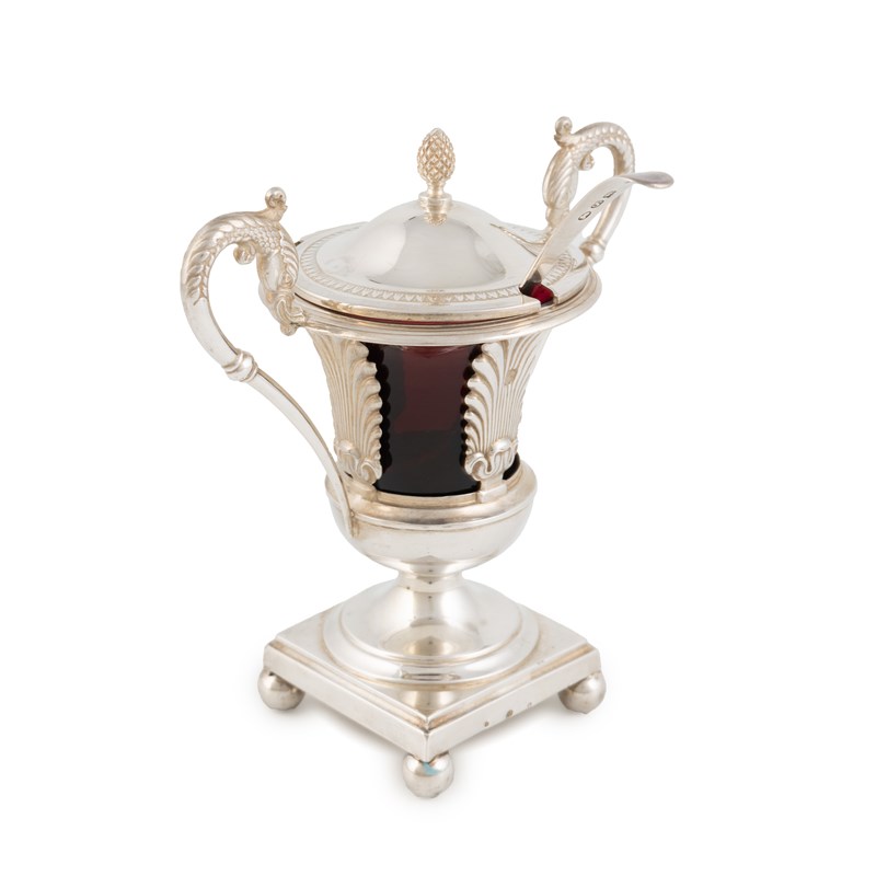 campana vase form, leaf-capped scroll handles, the hinged cover with a cone finial, on a square base, with a red glass liner and later English spoon, height 13.5cm, approx. weight 5.3oz. (2)