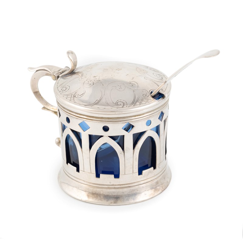 circular form with pierced arch decoration, the cover with engraved scroll decoration, scroll handle, with a blue glass liner and spoon, approx. total weight 3.8oz. (2)