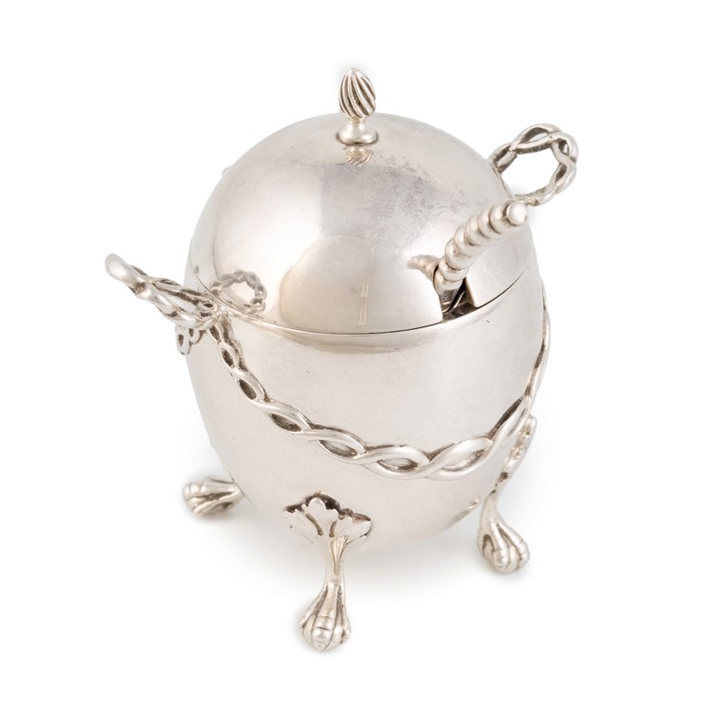 plain egg form with intertwined garland decoration, pierced handles, the cover with a flame finial, on four acanthus leaf capped claw on ball feet, with an associated spoon, height 8.8cm. approx. total weight 4.1oz. (2)
