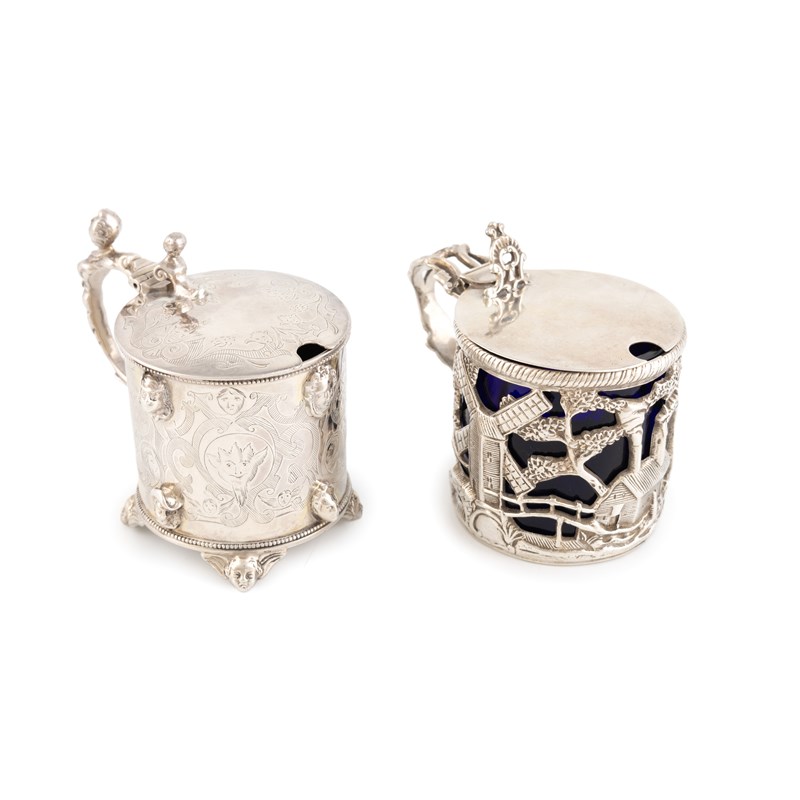 circular form with engraved scroll and mask decoration, applied masks to the body, caryatid scroll handle, on four winged cherub mask feet, with a later blue glass liner, plus a silver mustard pot by Wakely & Wheeler, London 1911, circular form with a pierced rural scene, with a blue glass liner, approx. total weight 8.5oz. (2)