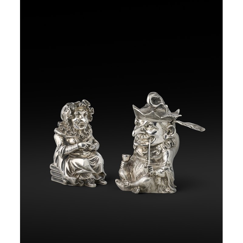 A rare Victorian novelty silver Mr Punch mustard pot and Mrs Judy Punch pepper pot,
