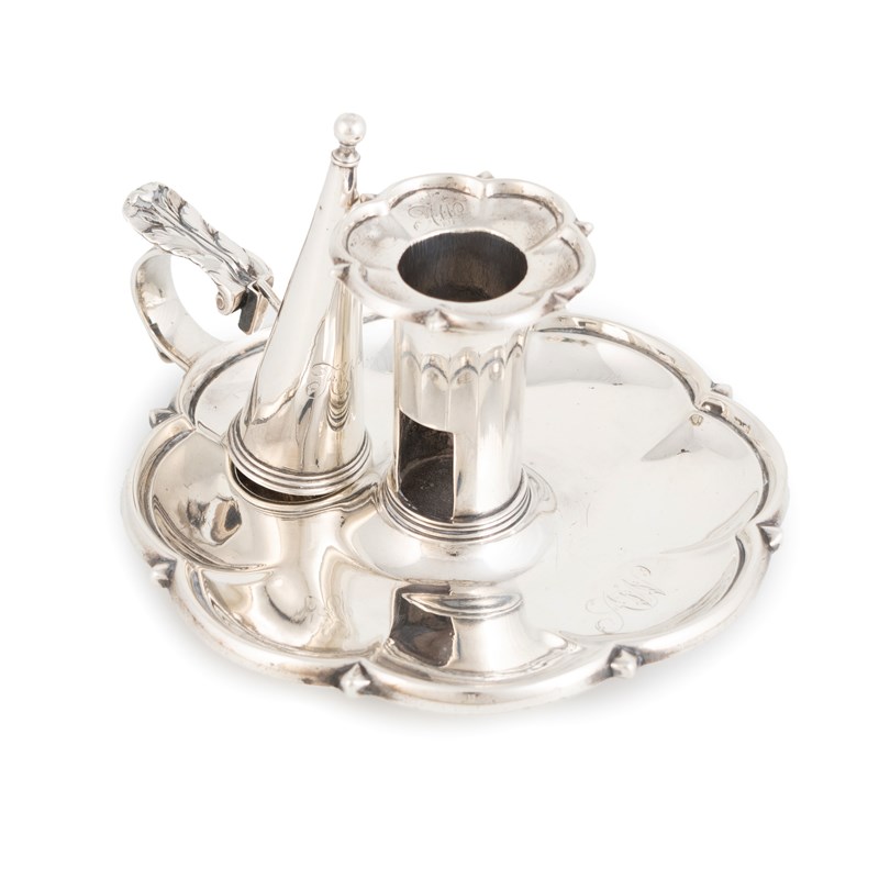octofoil form with a moulded edge, central cylindrical stem with a pull-off drip pan, engraved initials, scroll handle, with a detachable conical snuffer, diameter 15.5cm, approx. weight 8.6oz.