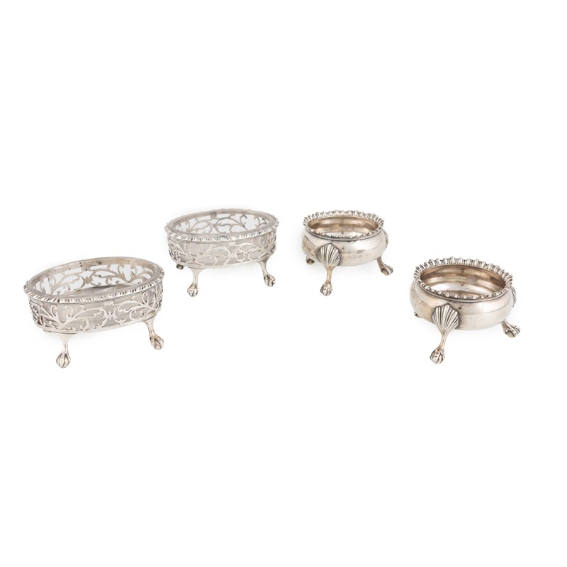 oval form with gadrooned borders, pierced scroll decoration, later clear glass liners, on four claw and ball feet, length 9.4cm, plus a pair of George III silver salt cellars by David & Robert Hennell, London 1768, total approx. weight 11.2oz. (4)