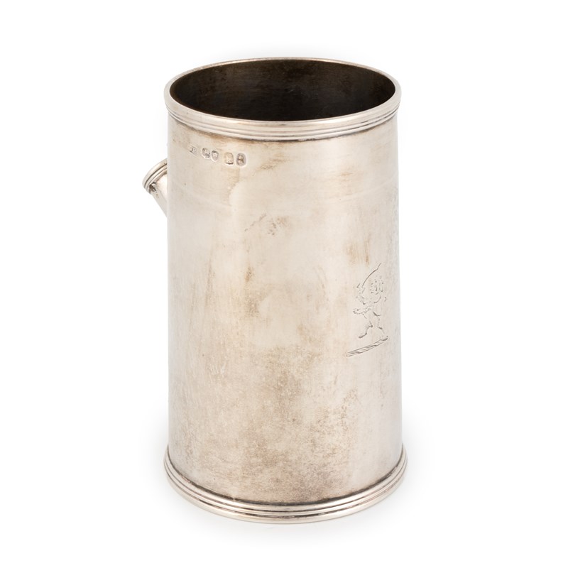 tapering circular form, reeded borders, lacking side handle, engraved with a crest, the underside inscribed 'Presented by Mrs Evans to Horace C Pilcher Esq. 28 December 1869, This pot was formerly the property of Sheriff William Evans', height 11.3cm, approx. weight 7.5oz.